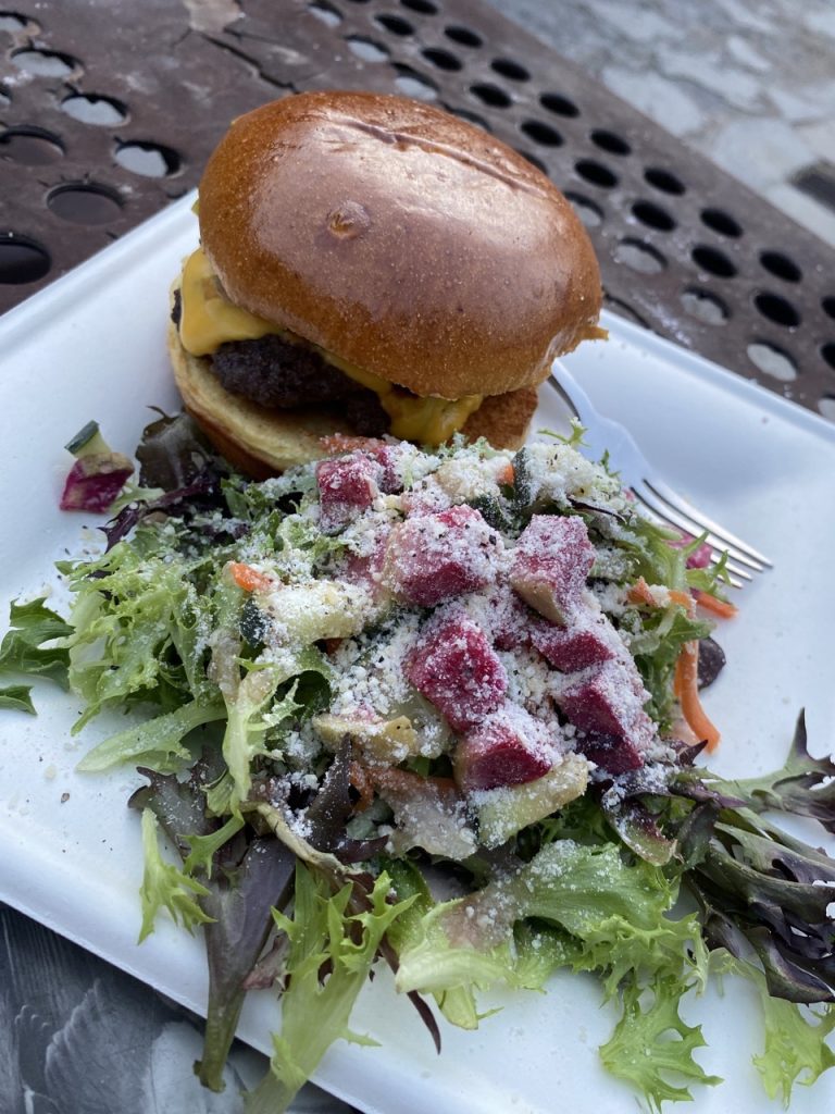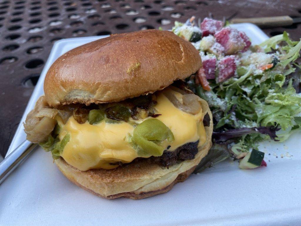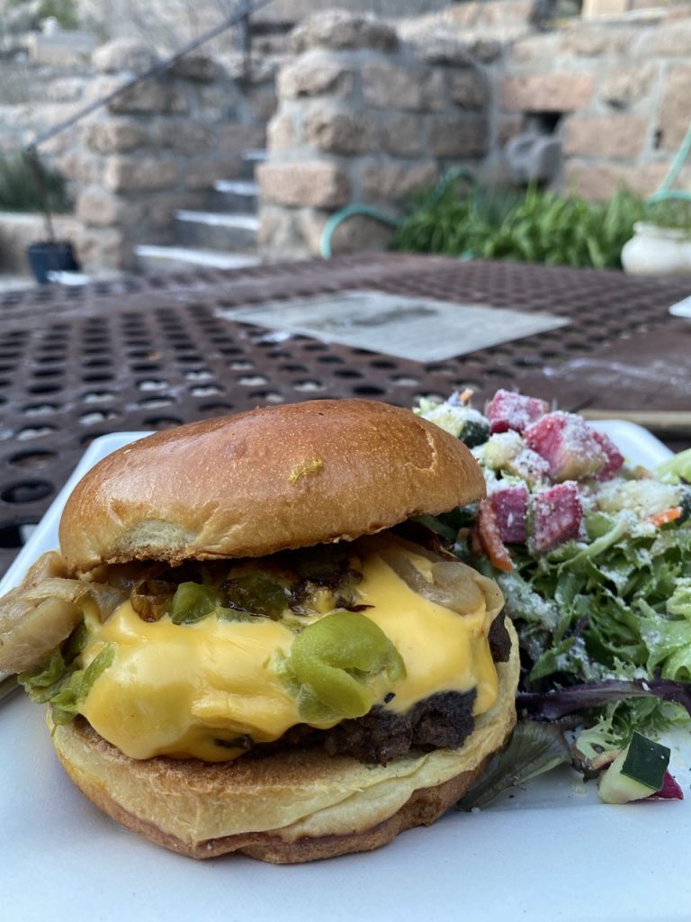 The New Mexico True Burger: Angus chuck, double cheese, caramelized onions, and green chile on a brioche bun. Served with a spring mix salad made with seasonal vegetables and berry vinaigrette dressing. All the salad components can also be found in the chicken and berry dressing.
