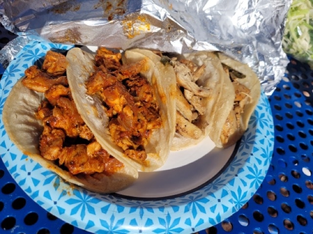 The menu is broken into four main categories Burritos, Tacos, Quesadillas, and Hot Dogs with multiple options in each category. I will preface this review by saying I have yet to try their hotdogs. I am generally not a hotdog person and I love their tacos so much it feels morally wrong to go there and not order a taco. You can get your choice of red or green chile sauce or both as well as a baggy of toppings for tacos which includes a cabbage cilantro mix, lime wedge, and whole grilled pepper.
