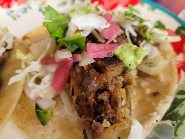 The tacos are my favourite for multiple reasons, you can mix and match up to 4 options in one taco order and customize the toppings and sauce to your preference. My go-to order for myself is always a Pollo con Limon, Carnitas, Picadillo, and Al Pastor. I know, I have covered all the food groups there but hear me out, they are all so good in their own ways! The Pollo con Limon is chicken cooked with onions and jalapenos. It is a spicy flavourful chicken with a bite of lime at the end that honestly doesn’t need any chile sauce. Carnitas is a lovely slow-cooked pork that is shredded and then cooked on the flat top, so it has a lovely, browned crust while still having a moist, porky bite. The picadillo is minced beef cooked with potatoes, onions, and chile which makes for a hearty filling taco that is almost reminiscent of an empanada. Finally, the Al Pastor which is pork marinated in adobo and cooked with pineapple. It is smoky and sweet and is topped off with a cabbage cilantro mix and chile. It hits every flavour note.