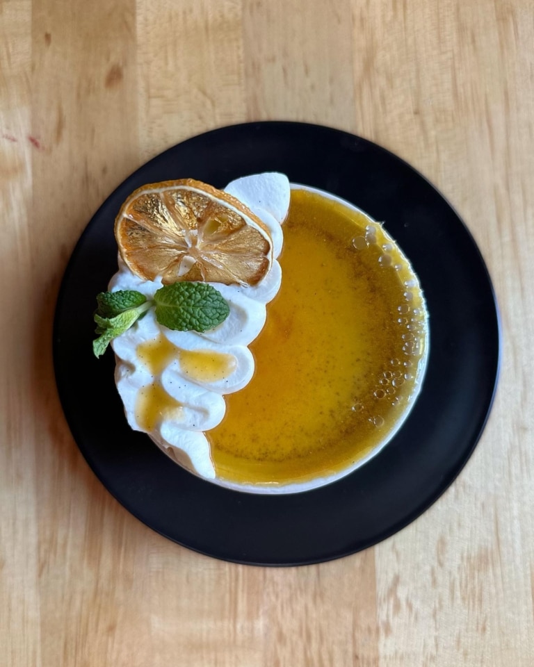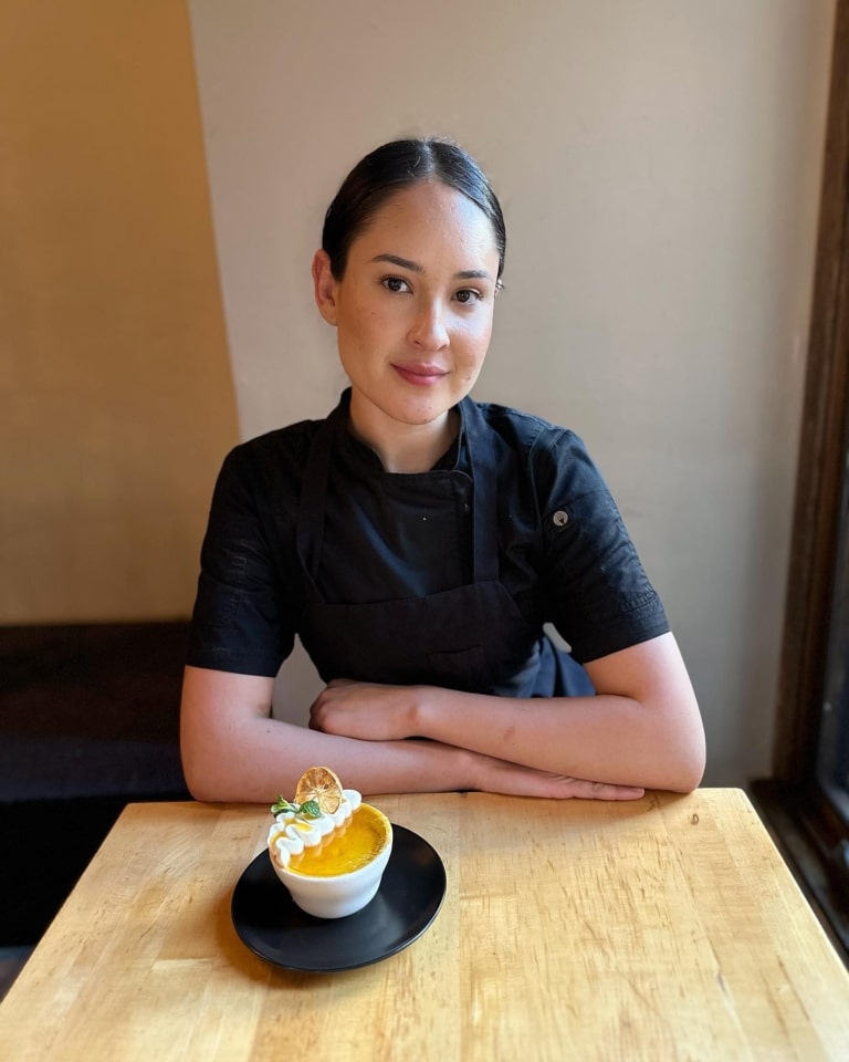 Amazingly talented Pastry Chef, Gabriela and her latest creation! This is a cinnamon, orange crème brûlée with edible sugar glass!