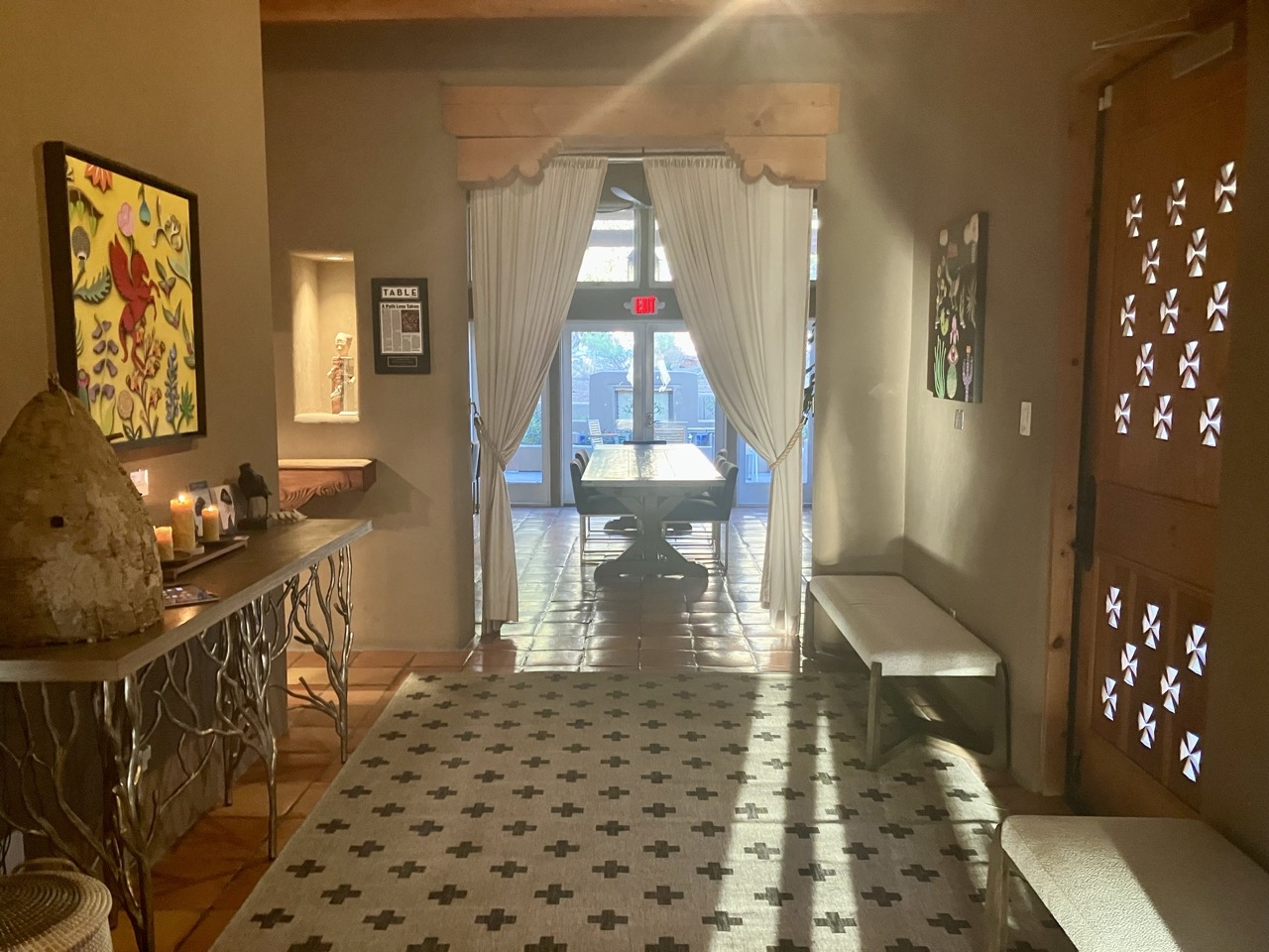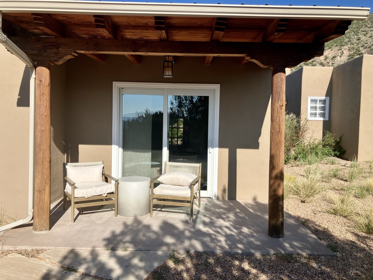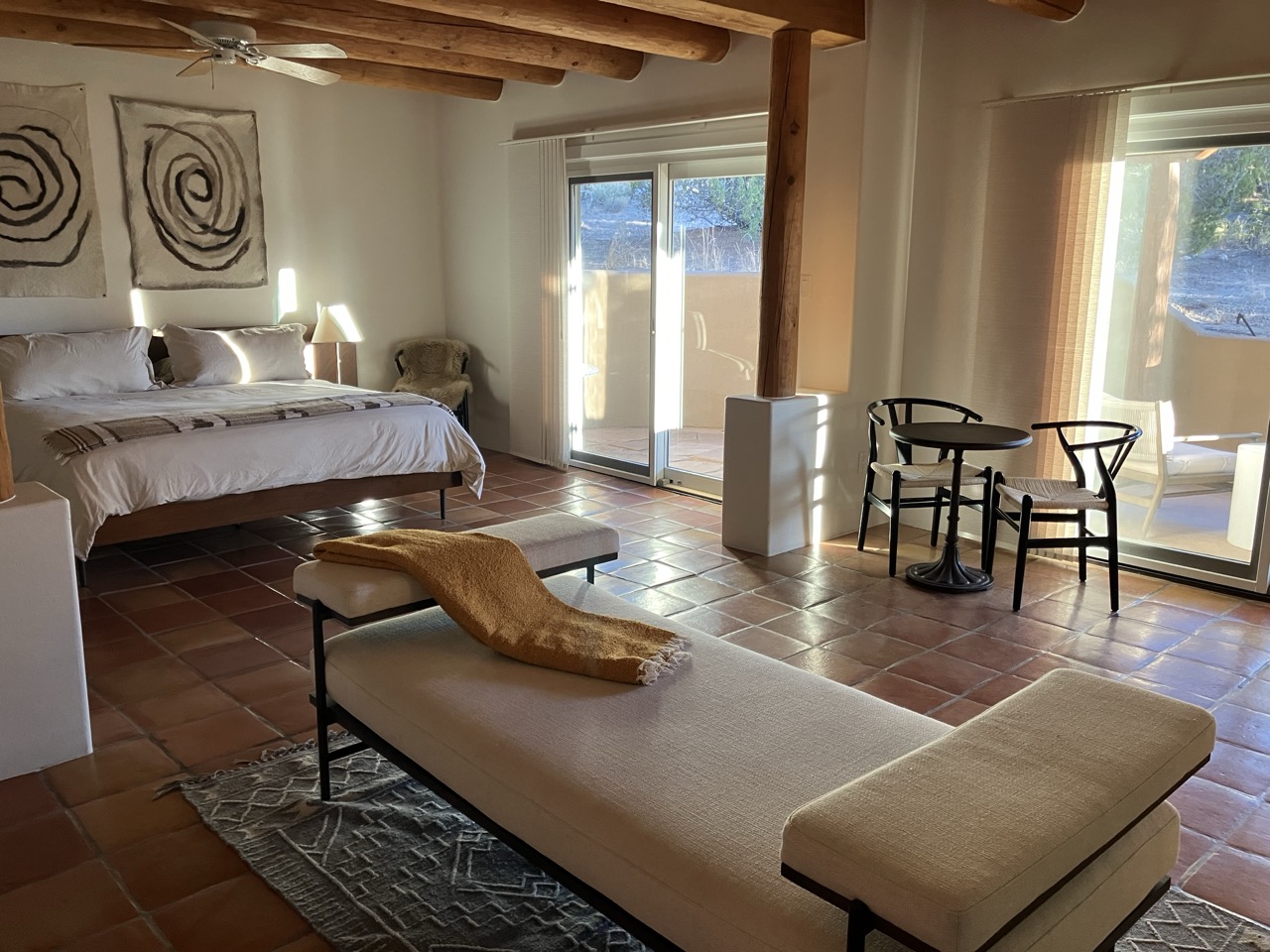 In the center of this haven is the restaurant, and adjacent to it, four suites to accommodate overnight guests. Designed in classic New Mexico style with white adobe walls, vigas mounted on the ceiling, Mexican Saltillo tile flooring, and a wood-burning kiva, the inn offers all the comforts of home with the added luxury amenities of a high-end hotel. A microwave and mini refrigerator are provided, but there is no television. Each room has a private patio overlooking the scenic Southwest landscape to capture and captivate the imagination. Void of distractions, these suites have been thoughtfully designed to provide their guests with a place for rest, solace, and sanctuary.