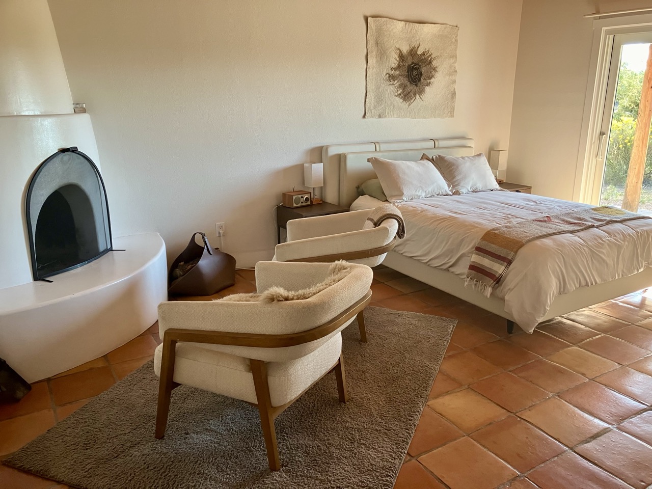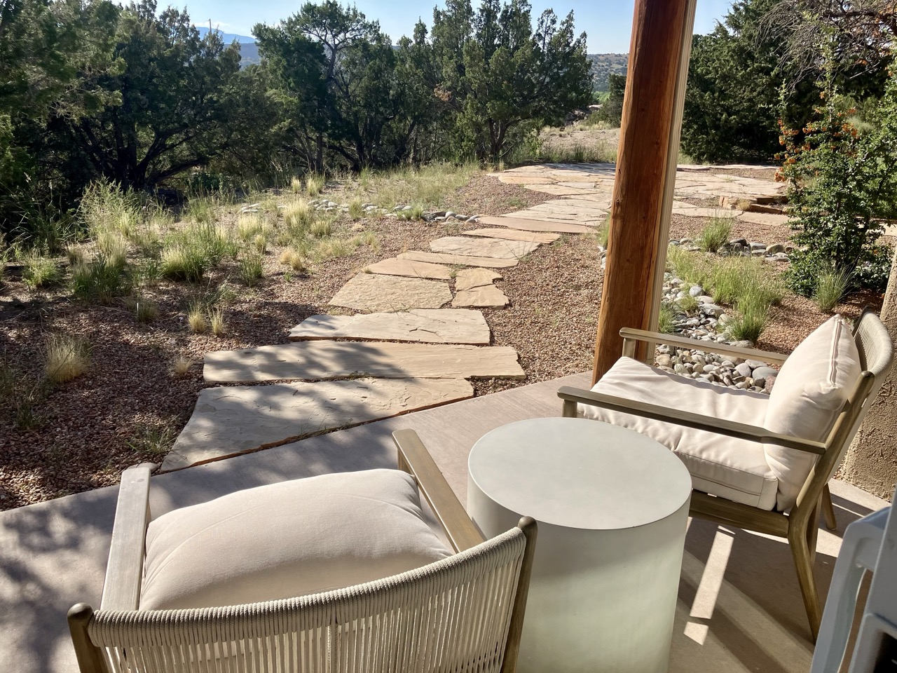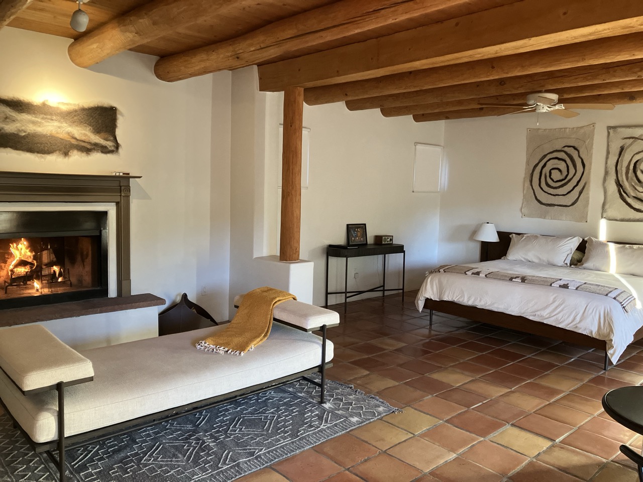 In the center of this haven is the restaurant, and adjacent to it, four suites to accommodate overnight guests. Designed in classic New Mexico style with white adobe walls, vigas mounted on the ceiling, Mexican Saltillo tile flooring, and a wood-burning kiva, the inn offers all the comforts of home with the added luxury amenities of a high-end hotel. A microwave and mini refrigerator are provided, but there is no television. Each room has a private patio overlooking the scenic Southwest landscape to capture and captivate the imagination. Void of distractions, these suites have been thoughtfully designed to provide their guests with a place for rest, solace, and sanctuary.