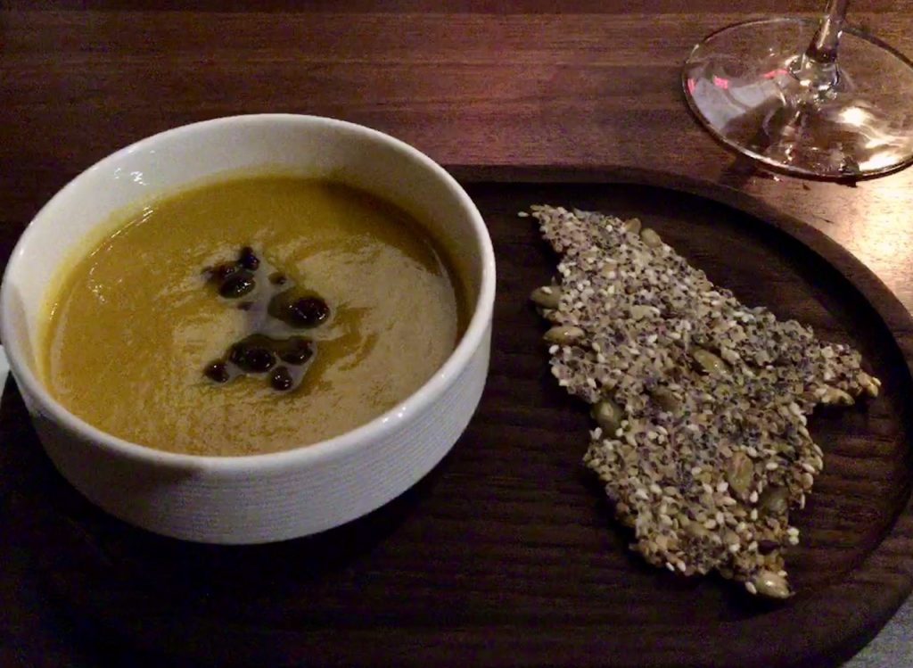Next, a Nicoise salad with fingerling potatoes, confit tuna, boquerones, local tomatoes, haricot verts, and farm eggs, with a tomato, basil, and avocado oil base. Simply plated, the vegetables tasted vibrant, fresh, and earthy, and the egg, potato, and tuna made it satisfyingly hearty. Carrot soup was third on the menu. A rich golden broth topped with sweet berries, and incredibly savory and velvety, this dish was sublime and a must-have for autumn’s menu.
