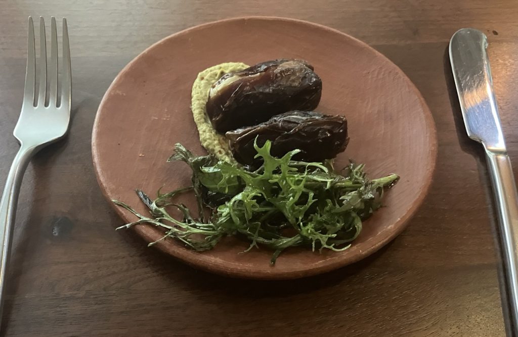 My dinner began with Medjool dates with triple cream cheese, pistachio puree, and mustard frills. The pale gold-colored puree paired with the greens looked deceptively bitter, but the combination was surprisingly sweet. The dates were soft and chewy with a buttery richness reminiscent of caramel. A delicious and delightful starter, I was excited for more.