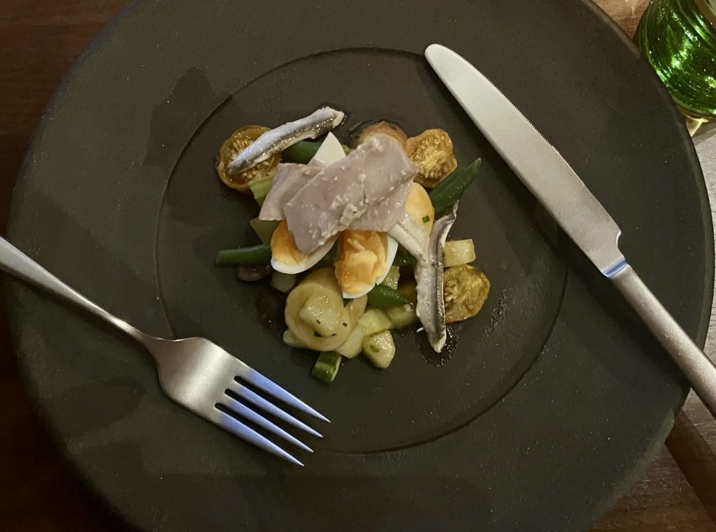 - Nicoise salad with fingerling potatoes, confit tuna, boquerones, local tomatoes, haricot verts, and farm eggs, with a tomato, basil, and avocado oil base