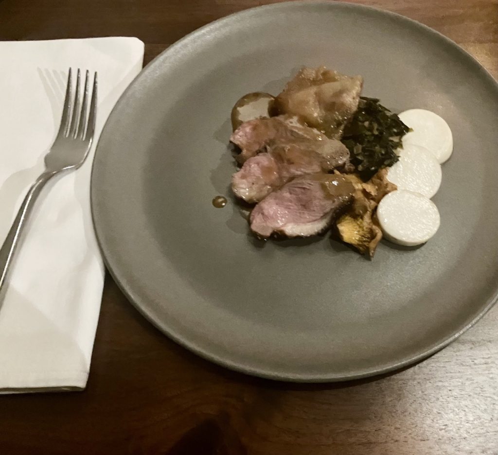 - Roasted duck with hakurei turnips, turnip greens, and locally foraged chanterelle mushrooms
