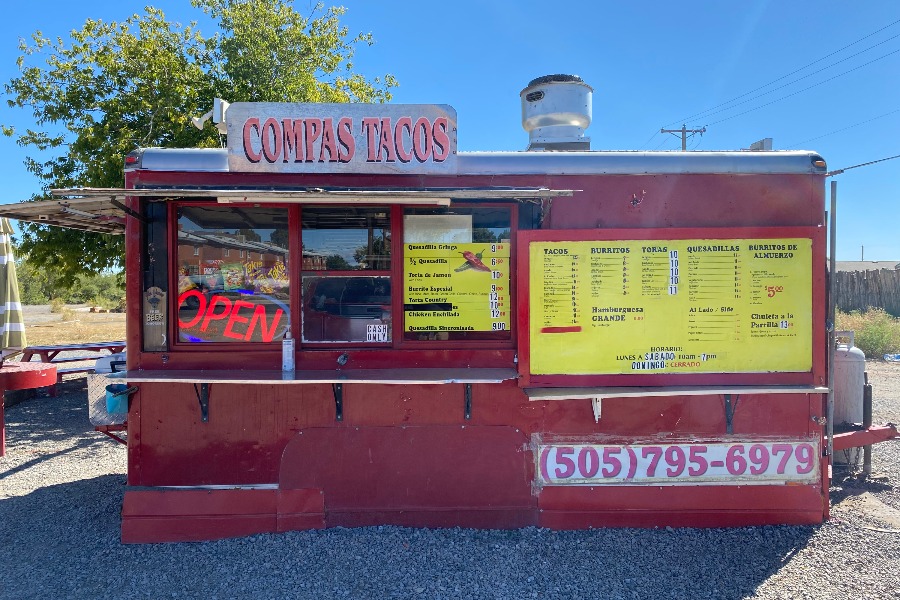 Mexican taco food truck located on Airport Road on the south side of Santa Fe.